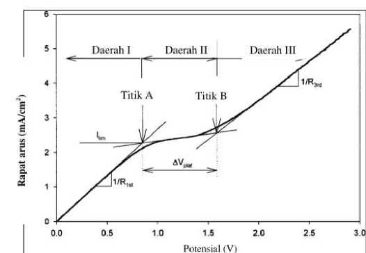 Kurva I-V membran pertukaran ion dapat dibagi menjadi tiga daerah, seperti tampak pada Gambar 1 [7, 8]. Daerah I merupakan daerah ohmik yaitu kenaikan rapat arus bersesuaian dengan kenaikan beda potensial listrik, yang memenuhi hukum Ohm. Daerah II adalah daerah plateau dimana peningkatan potensial menyebabkan kenaikan rapat arus yang sangat kecil atau nilai arus hampir konstan dan daerah III merupakan daerah asymtotik (daerah electrical noise).