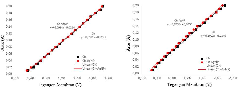 Hasil pengukuran I-V dari membran Ch dan membran komposit Ch-AgNP pada larutan KCl dan NaCl dengan konsentrasi 0,025 M diperlihatkan pada Gambar 2.