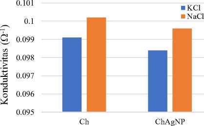 Gambar 3 memperlihatkan bahwa nilai konduktansi membran Ch dan membran komposit Ch-AgNP pada larutan KCl secara berturut-turut adalah 0,0991 Ω-1 dan 0,0984 Ω-1. Pada larutan NaCl, nilai konduktansi membran Ch adalah 0,1002 Ω-1 dan nilai konduktansi membran komposit Ch-AgNP adalah 0,0996 Ω-1. Nilai konduktansi yang lebih besar menunjukkan bahwa kemampuan suatu membran dalam mengalirkan ion lebih besar [7,10]. Dari hasil pengamatan tampak bahwa nilai konduktansi membran Ch lebih besar dibandingkan membran komposit Ch-AgNP. Adanya penambahan AgNP menyebabkan penurunan nilai konduktansi membran. Hal ini dapat disebabkan oleh berkurangnya kerapatan pori-pori membran karena beberapa pori-porinya terisi AgNP [11]. Oleh karena itu, kemampuan membran dalam transport ion menjadi menurun, sehingga nilai konduktansi membran juga menurun.