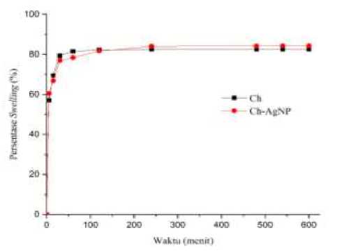 Untuk mengetahui laju penyerapan air pada masing-masing membran dapat diplot antara persentase swelling terhadap waktu. Persentase swelling dari membran Ch dan membran komposit Ch-AgNP sebelum digunakan untuk transport ion diperlihatkan pada Gambar 4.