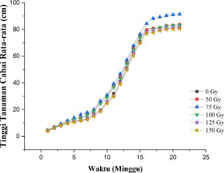 Gambar 1 menunjukkan data pertumbuhan tanaman cabai, yaitu perubahan tinggi tanaman terhadap waktu dalam satuan minggu. Dapat teramati pada semua kelompok perlakuan (kontrol, 50, 75, 100, 125 dan 150 Gy) bahwa sampai pada minggu ke-8 laju pertumbuhan masing-masing yaitu 1,61 cm/minggu, 2,00 cm/minggu, 2,19 cm/minggu, 1,94 cm/minggu, 1,50 cm/minggu dan 1,42 cm/minggu. Dari minggu ke-8 sampai ke-15, tanaman tumbuh lebih cepat yaitu masing-masing dengan laju 8,10 cm/minggu, 8,02 cm/minggu, 8,20 cm/minggu, 7,95 cm/minggu, 8,07 cm/minggu dan 8,08 cm/minggu. Dari minggu ke-15 sampai ke-21 tanaman tumbuh melambat, yaitu dengan laju masing-masing 1,34 cm/minggu, 1,31 cm/minggu, 2,16 cm/minggu, 1,40 cm/minggu, 1,50 cm/minggu dan 1,46 cm/minggu.