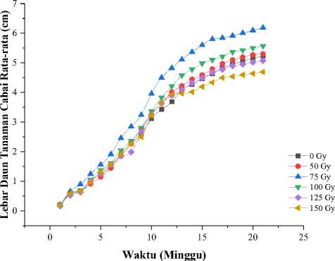 Hasil rata-rata untuk lebar daun cabai seperti ditunjukkan pada Gambar 2. Dari gambar tersebut dapat diamati bahwa lebar daun tampak berbeda untuk setiap kelompok sampel. Laju pertumbuhan daun paling cepat terjadi pada sampel dengan pemberian dosis 75 Gy. Dari uji statistik diperoleh bahwa tidak ada pengaruh secara signifikan pemberian radiasi gamma pada biji cabai terhadap pertumbuhan daun tanaman cabai.