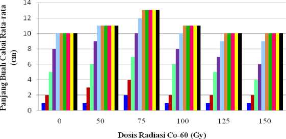 Efek dari radiasi gamma pada benih cabai terhadap panjang dari buah cabai ditunjukkan pada Gambar 4. Dapat teramati bahwa panjang buah yang dihasilkan hampir sama untuk pemberian radiasi gamma dengan dosis 0 (kontrol), 50, 100, 125 dan 150 Gy. Sementara itu, pemberian radiasi gamma 75 Gy pada benih meghasilkan buah yang lebih panjang. Namun demikian secara statistik perbedaan yang diperoleh tidak berbeda secara signifikan.