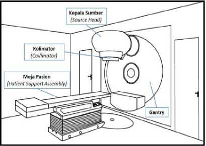 Pesawat Co-60 terdiri dari beberapa komponen utama, yaitu kepala sumber (source head), kolimator, gantry, meja pasien dan komputer konsul. Bagian-bagian pesawat Co-60 ditunjuukan pada Gambar 2.