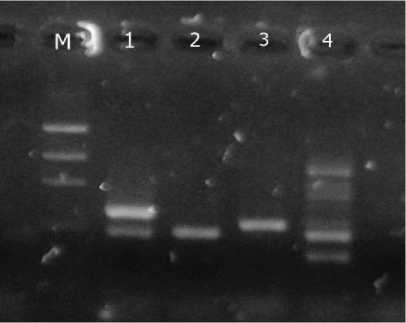 Gambar 1. Eletroforesis Produk PCR dengan Gel Agalrose 1% yang diwarnai Etidium Bromide dengan Marker 100 bp DNA Ladder. Keterangan: Marker (M), sampel KRL01 (1), sampel KRN01 (2), sampel KRG01(3), dan sampel KRQ01 (4)