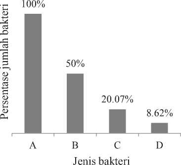 Gambar 1 di atas menunjukkan bahwa bakteri Coliform ditemukan pada semua sampel di uji (100%), dan dari keseluruhan bakteri Coliform tersebut sebanyak 50% positif E. coli. Analisis lebih lanjut terhadap keseluruhan bakteri E. coli ditemukan bahwa sebanyak 12,07% positif terdeteksi sebagai strain E. coli O157 dan selanjutnya 8,62% dinyatakan positif E. coli O157:H7. Persentase perbandingan Coliform, E. coli, E. coli O157 dan E. coli O157:H7 yang didapat yaitu 100; 50; 12.0 dan 8.62% lebih tinggi dari hasil penelitian pada feses manusia yang dilakukan oleh Suardana et al., (2008) pada feses manusia yang menemukan bahwa perbandingan antara Coliform, E. coli, E. coli O157 dan E. coli O157:H7 masing-masing sebesar 89,61; 15,58; 6,49 dan 1,3%.