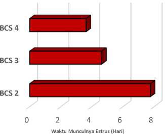Rataan terhadap munculnya estrus pada ketiga kelompok perlakuan setelah penyuntikan GnRH adalah 7.75 + 0.89 hari, 4.63 + 0.52 hari dan 3.63 + 0.52 hari, masing-masing untuk BCS 2, BCS 3 dan BCS 4.Waktu munculnya estrus secara statistik menunjukkan perbedaan yang nyata (P<0,05) sesudah penyuntikan GnRH antara Kelompok I, II dan III. Perbedaan waktu munculnya estrus sesudah penyuntikan GnRH antara kelompok I, II dan III lebih jelas dapat dilihat pada diagram 1.
