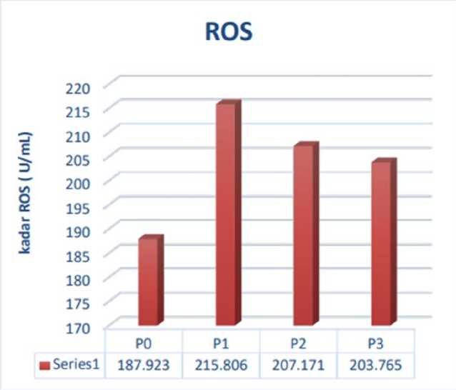 Hasil penelitian menunjukkan bahwa pemberian ekstrak kayu secang dapat menurunkan kadar ROS pada eritrosit mencit jantan pasca paparan asap rokok konvensional. Berdasarkan gambar 1, kelompok P1 memiliki rata-rata jumlah kadar ROS tertinggi dibandingkan kelompok lainnya, yaitu sebesar 215.806 U/mL. Sedangkan pada kelompok P0 memiliki kadar ROS rata-rata sebesar 187.923 U/mL, kemudian P2 sebesar 207.171 U/mL dan P3 sebesar 203.765 U/mL. Sedangkan menurut analisis statistik menunjukkan bahwa tidak ada perbedaan secara signifikan pada semua perlakuan (P>0,05).
