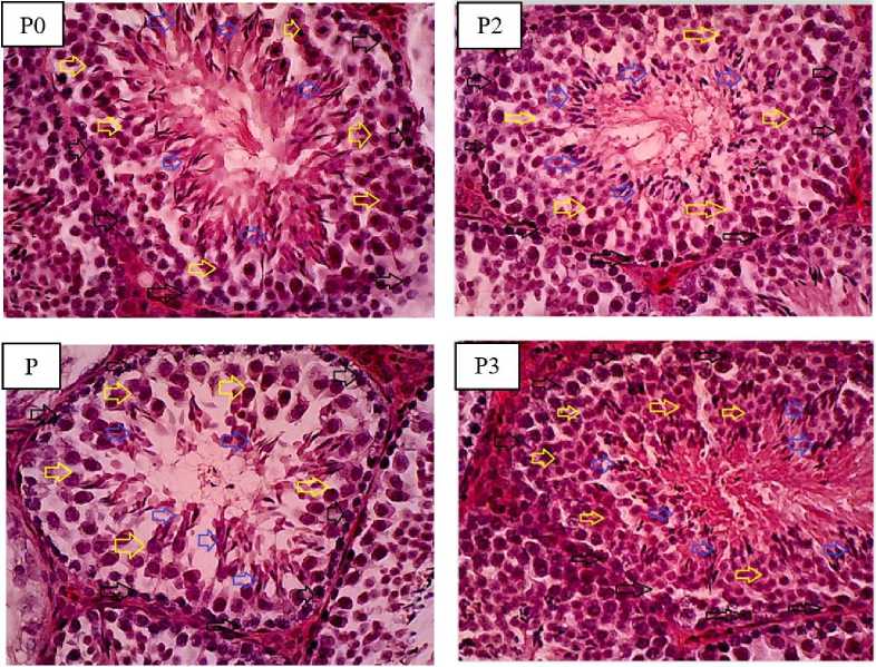 sedangkan pada perlakuan P3 tidak berbeda signifikan (P>0,0,5). Untuk P1 berbeda signifikan dengan P0, P2 dan P3 (P<0,01). Pada perlakuan P2 berbeda signifikan dengan P0 (P<0,01), P1 (P<0,01) dan P3 (P<0,0,5). Untuk P3 tidak berbeda signifikan dengan P0 (P>0,05), dan berbeda signifikan pada P1 (P<0,01) serta P2 (P<0,05). Nilai spermatosit perlakuan P0 berbeda siginfikan dengan P1 dan P2 (P<0,01), sedangkan pada P3 tidak berbeda signifikan (P>0,0,5). Pada perlakuan P1 berbeda signifikan dengan P0 (P<0,01), P2 (P<0,05), dan P3 (P<0,01). Untuk perlakuan P2 berbeda siginfikan dengan P0 (P<0,01), P1 dan P3 (P<0,05). Sedangkan perlakuan P3 tidak berbeda signifikan dengan P0 (P>0,05), namun berbeda signifikan pada P1 (P<0,01) dan P2 (P<0,05). Nilai spermatid perlakuan P0 berbeda signifikan dengan P1 (P<0,01), namun tidak berbeda signifikan dengan P2 dan P3 (P>0,05). Pada perlakuan P1 berbeda nyata dengan semua perlakuan (P<0,01). Sedangkan perlakuan P2 berbeda nyata dengan P1 (P<0,01) dan tidak berbeda signifikan pada P0 dan P3 (P>0,05). Dan perlakuan P3 tidak berbeda signifikan dengan P0 dan P2 (P>0,05) dan berbeda signifikan dengan P1 (P<0,01).