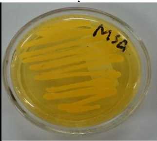Figure 2. Colonies of Staphylococcus aureus are yellow on mannitol salt agar.