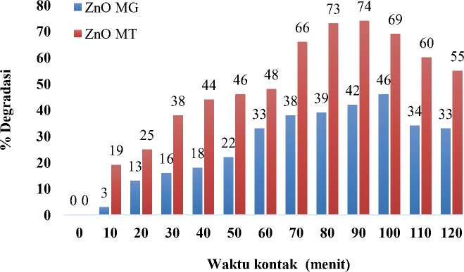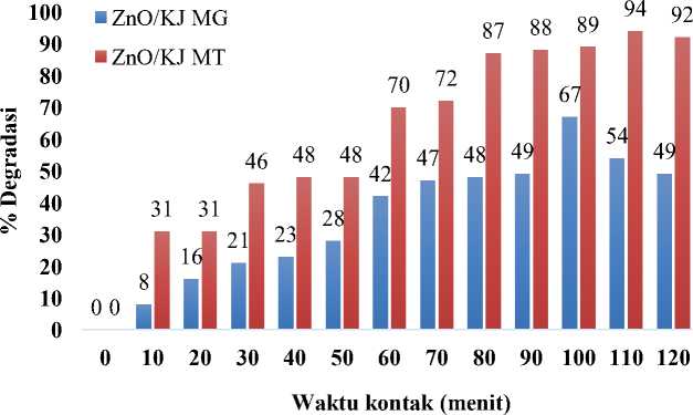 Persentase metilen biru yang berhasil terdegradasi oleh ZnO dan ZnO/KJ pada suhu kamar pada 25 °C sebagai fungsi waktu kontak dimana konsentrasi awal metilen biru adalah sebesar 6 mg/L ditampilkan pada Gambar 6. Nilai persen degradasi tertinggi menggunakan ZnO/KJ adalah sebesar 67 % pada mode gelap dan 94 % pada mode terang. Sedangkan ZnO hanya mampu mendegradai metilen biru sebesar 46 % pada mode gelap dan 74% pada mode terang. Dengan demikian, ZnO/KJ lebih efektif digunakan untuk menghilangkan zat warna metilen biru daripada ZnO.