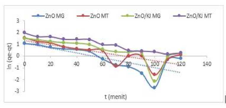Gambar 7. Grafik kinetika adsorpsi pseudo orde pertama ZnO dan ZnO/KJ
