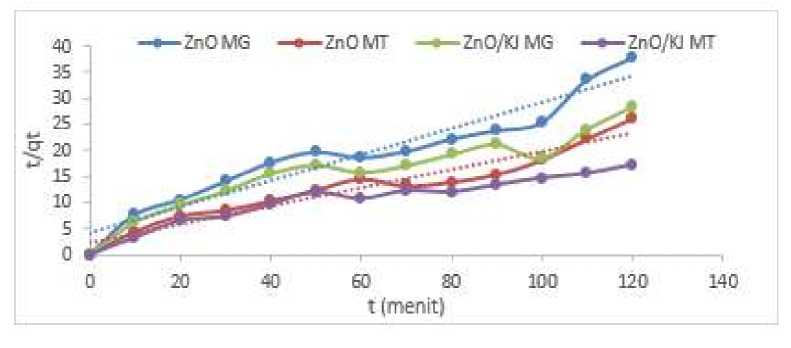 Gambar 8. Grafik kinetika adsorpsi orde dua semu ZnO dan ZnO/KJ