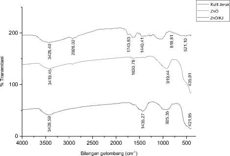 Sedangkan untuk ZnO/KJ, puncak serapan yang melebar pada gelombang 3428,59 cm-1 merupakan vibrasi regangan OH dari molekul yang terserap pada permukaan ZnO. Kemudian, daerah sekitar 1435,27 cm -1 adalah vibrasi C-H dari gugus metil, metilen, metoksi aromatik dan alifatik yang menunjukkan bahwa kulit jeruk telah masuk ke dalam ZnO. Sedangkan keberadaan ZnO dapat dilihat pada bilangan gelombang gelombang 421,95 cm-1 [5].
