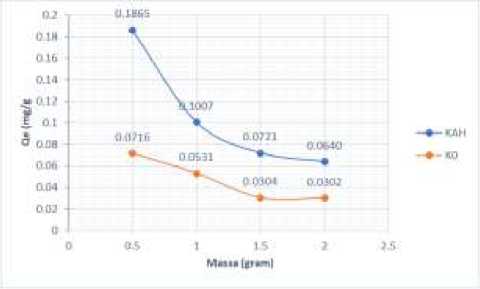Penentuan massa optimum KAH dan K0 terhadap limbah cair tahu dengan menggunakan variasi massa 0,5; 1,0; 1,5 dan 2,0 gram, dengan konsentrasi limbah cair tahu 5,245 mg/L. pengaruh massa terhadap daya serap biosorben dapat lihat pada Gambar 2.