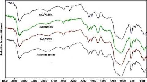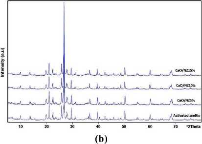 Spectroscopy spectra of the CaO/natural zeolite are shown in Figure. 1a. Note that there are no significant alteration on absorption peaks. All of the CaO/natural zeolite catalysts show the same characteristic with the activated zeolite. This result indicates that the structure of