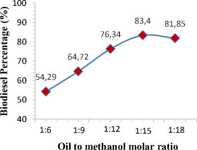 Figure 2. Effect of waste cooking oil to methanol molar ratio on biodiesel percentage