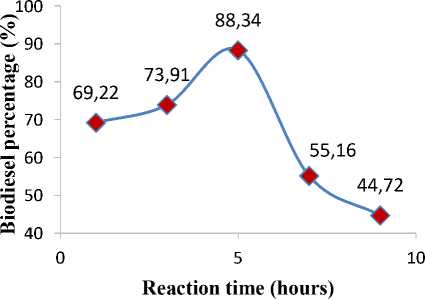 According to the result shown in Figure 3, it can be seen that the biodiesel percentage increases with the reaction time increases. The highest yield (88.34%) was achieved in 5 hours. Subsequently, biodiesel yield was decreased steadily beyond 5 hours due to increasing production of glycerol. Since the transesterification reaction was reversible, excess glycerol may shifted back the