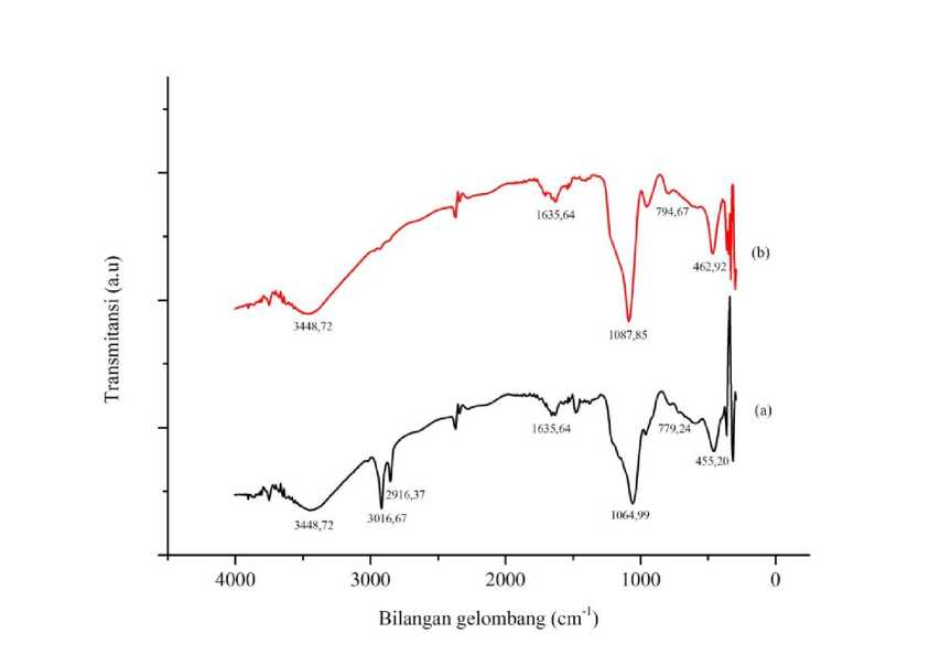 Gambar 2. Spektra FTIR MCM-41 kondisi optimum: (a) sebelum dan (b) setelah kalsinasi