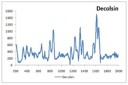 Gambar 1. Spektrum Raman tablet obat Decolsin (atas) dan Tramifen (bawah).