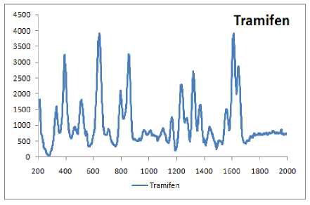 Dari data yang diperoleh diketahui bahwa pola puncak yang khas dari Tramadol Hidroklorida yaitu 1006 cm-1 (cincin aromatis rentang I), 1467 cm-1 (cincin aromatis rentang II), 1552 cm-1 (C-OH), 1635 cm-1 (C=C), 285 cm-1 (C-C Alifatik), 1345 cm-1 (C-N) dan 855 cm-1 (CO-C).