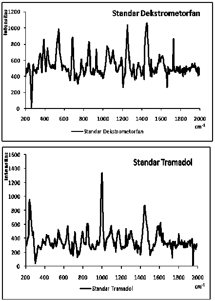 Serbuk baku Efedrin Hidroklorida, serbuk baku Dekstrometorfan, serbuk baku Tramadol Hidroklorida ditempatkan pada gelas objek dan diukur dengan spektroskopi Raman. Spektrum Efedrin Hidroklorida, Dekstrometorfan dan Tramadol