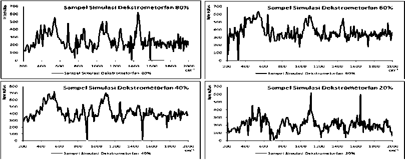 Spektrum sampel simulasi Efedrin Hidroklorida, Dekstrometorfan dan Tramadol Hidroklorida pada konsentrasi 20%, 40%, 60% dan 80% diukur dengan spektroskopi Raman. Selanjutnya masing – masing spektrum dianalisis dengan cross corelation function untuk mengetahui kedekatan spektrum sampel simulasi dengan masing – masing spektrum serbuk standar. Spektrum Raman kemudian dibandingkan antar konsentrasi untuk melihat perubahan pola spektrum yang terjadi.