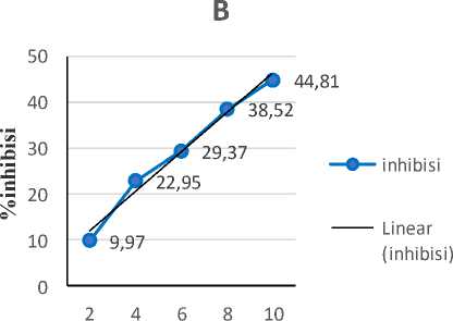 Hasil kurva regresi linier ekstrak etanol daun gedi pada Gambar 1.A. menunjukkan bahwa seiring bertambahnya konsentrasi ekstrak yang dimasukkan ke dalam larutan DPPH 0,004% hingga pada konsentrasi 10 ppm peredaman senyawa DPPH semakin tinggi. Hal tersebut menggambarkan bahwa kandungan metabolit sekunder yang terdapat di dalam ekstrak etanol daun gedi dapat mendonorkan atom H-nya dari guguh OH untuk meredam senyawa radikal [8]. Hal yang sama juga ditunjukkan pada Gambar 1.B yang menunjukkan pertambahan konsentrasi asam askorbat hingga 10 ppm dapat menhambat radikal DPPH hingga 44,81%.