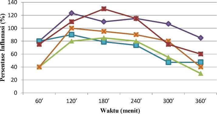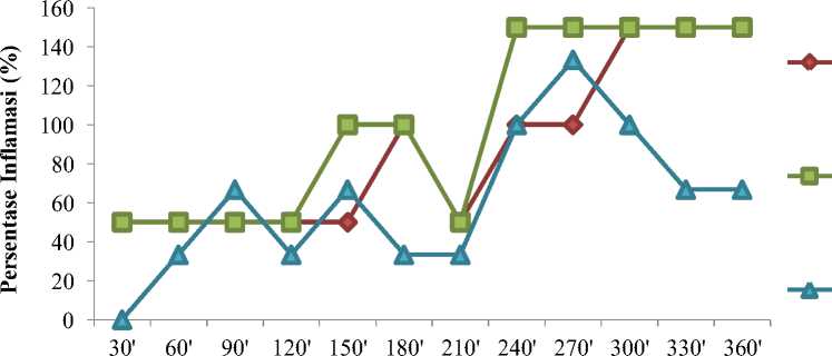 Persentase inflamasi rata-rata pada K1 dan K3 seringkali mengalami kenaikan maupun penurunan dari awal hingga akhir perlakuan. Berbeda dengan K2 yang terlihat lebih stabil seperti pada menit ke-30 hingga menit ke-120 dengan persentase inflamasi 50%, dan menit ke-240 hingga menit ke-360 dengan persentase inflamasi 150% seperti yang ditunjukkan pada Gambar 1.