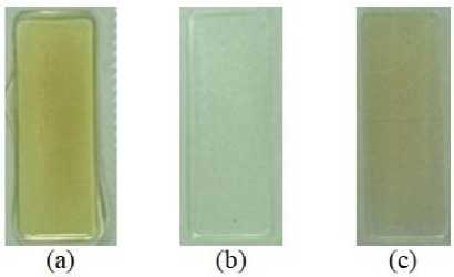 Gambar 3. Sampel lapisan tipis; (a) karet alam, (b) kitosan dan (c) karet alam-kitosan.