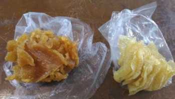 Gambar 4. Karet alam berwarna coklat dan warna pucat karet alam-kitosan 5%.