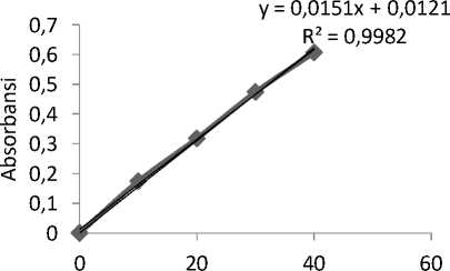adsorbansi sebagai sumbu y dan panjang gelombang sebagai sumbu x, sehingga dapat diketahui panjang gelombang maksimum dari puncak yang terbentuk yaitu 553,6 nm. Panjang gelombang yang telah didapat digunakan untuk pembuatan kurva kalibrasi. Konsentrasi larutan rhodamin B yang digunakan dalam yaitu 0, 10, 20, 30 dan 40 mg/L. Pembuatan kurva kalibrasi dilakukan dengan pengukuran masing-masing larutan Rhodamin B dalam panjang gelombang maksimum (Gambar 1). Berdasar kurva di atas diketahui nilai R² sebesar 0,9982. Nilai ini menunjukan hubungan yang linier antara adsorbansi dan konsentrasi larutan yang diukur. Persamaan regresi linier yang diperoleh adalah y = 0,0151x + 0,0121.