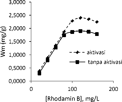 Oleh karena itu, dapat dilihat bahwa kapasitas maksimum adsorpsi rhodamin B baik oleh arang teraktivasi maupun tanpa aktivasi paling besar pada kondisi pH 3 dengan kapasitas adsorpsi berturut-turut sebesar 2,2778 mg/g dan 2,0066 mg/g.
