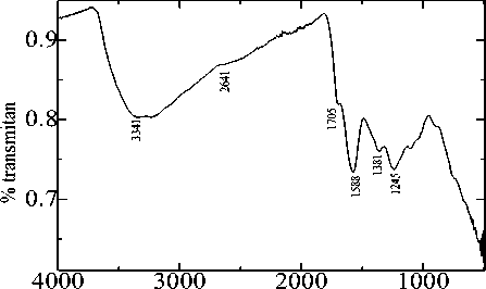 COOH, -OH, aromatik, alifatik dan kuinon. Berdasarkan spektra bisa diamati bahwa terdapat puncak serapan yang kuat dan melebar di daerah panjang gelombang 3341 cm-1 yang menunjukkan adanya stretching vibrations –OH. Serapan pada daerah panjang gelombang 1705 cm-1 menunjukkan adanya stretching vibrations C=O dari keton dan karboksilat. Puncak serapan yang terjadi di daerah panjang gelombang 1588 cm-1 merupakan stretching vibrations dari C=C aromatik serta H terkonjugasi dari keton. Serapan pada daerah bilangan gelombang 1381 cm-1 menunjukkan bending vibrations C-H dari CH3, serta di daerah panjang gelombang 1245 cm-1 menunjukkan adanya stretching vibrations C-O. Berdasarkan puncak-puncak yang terbentuk pada spektra IR menunjukkan bahwa asam humat yang digunakan telah sesuai dengan karakteristik senyawa humat itu sendiri yaitu adanya gugus fungsional -OH, -COOH, aromatik, alifatik dan kuinon [17].