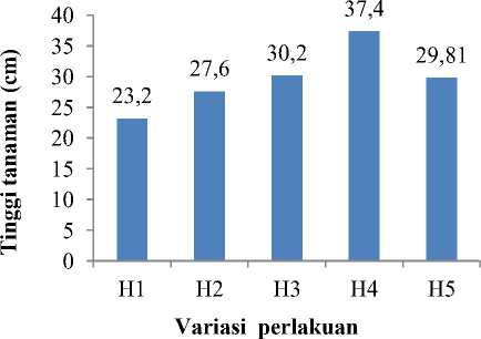 Adapun rata-rata hasil pengamatan tinggi tanaman bayam dalam lima kali pengulangan pada setiap perlakuan bisa diamati pada Gambar 2. Perlakuan H4 menunjukkan hasil yang paling nyata terhadap tinggi tanaman bayam. Hal ini disebabkan karena adanya penambahan asam humat bersama pupuk organik ecceng gondok. Riyandi [18] dalam penelitiannya menunjuk-kan bahwa asam humat memberikan pengaruh pada tanaman dengan meningkatkan pertumbuhan bagian akar dan daun tanaman binahong.
