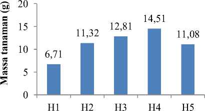Adapun hasil rata-rata untuk parameter pengamatan massa tanaman yang terdapat pada Gambar 4 menunjukkan bahwa pada perlakuan H4 menghasilkan massa tanaman yang paling berat. Data ini sejalan dengan data jumlah daun dan tinggi tanaman yang menunjukkan hasil yang lebih pada tanaman bayam, sehingga hasil data massa tanaman juga ikut besar.