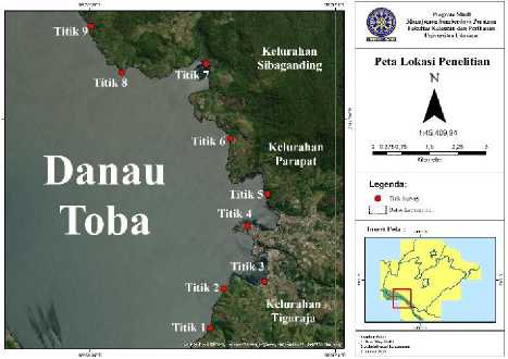 Penelitian ini dilakukan selama satu bulan, tepatnya pada bulan Januari tahun 2023. Sebanyak sembilan titik pengambilan sampel TSS ditetapkan di perairan Danau Toba Kecamatan Girsang Sipangan Bolon (Gambar 1), dimana masing-masing titik mewakili setiap kelurahan di Kecamatan Girsang Sipangan Bolon. Sampel air diambil di setiap titik pengambilan sampel dari permukaan perairan.