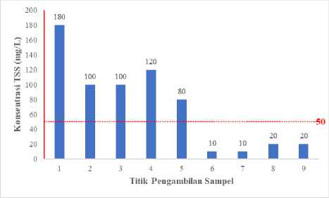 Padatan tersuspensi total (TSS) merupakan komponen organik dan anorganik tersuspensi dalam air yang dapat disaring menggunakan kertas milipore berpori-pori 0,45 μm (Anas et al., 2017). Berdasarkan hasil pengamatan nilai TSS di perairan Danau Toba Kecamatan Girsang Sipangan Bolon, terdapat beberapa titik pengambilan sampel yang nilainya sudah melebihi nilai baku mutu yang dipersyaratkan. Adapun nilai yang diperoleh yaitu dengan nilai berkisar antara 10-180 mg/L, dengan nilai rata-rata sebesar 71,11 mg/L. Titik 1 memiliki konsentrasi TSS tertinggi, yaitu 180 mg/L.