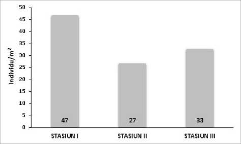 Berdasarkan hasil pengumpulan data pada stasiun stasiun penelitian terdapat perbedaan kelimpahan Krustasea berkisar 27-47 ind/m2. Kelimpahan tertinggi sebesar 47 ind/m2 terdapat pada stasiun I diikuti oleh stasiun III sebesar 33 ind/m2, sementara kelimpahan terendah ditemukan pada stasiun II yaitu 27 ind/m2 (Gambar 2). Stasiun I merupakan lokasi penelitan dengan kelimpahan tertinggi, diduga karena kondisi mangrove pada stasiun 1 lebih luas dibandingkan stasiun lainnya. Kondisi, kerapatan akan berpengaruh terhadap luas penutupan kanopi dan bahan organik yang dihasilkan. Adanya penutupan kanopi yang luas dan rapat menyediakan perlindungan bagi Krustasea dari sengatan sinar matahari secara langsung, juga dari predator, gelombang dan produksi serasah dari luruhan daun mangrove (Hartati, 2017). Selain itu diduga karena parameter perarian Stasiun 1 lebih baik dari pada stasiun lainnya dengan suhu tidak mencapai 30°C, pH 7.48, DO 6.09 mg/l, dan salinitas 27,82 ppt. Substat berpasir pada stasiun I juga diduga salah satu faktor yang mempengaruhi kelimpahan dimana pada substrat berpasir banyak ditemukan Krustasea. Substrat berpasir memiliki kandungan oksigen relatif lebih besar dibandingkan dengan substrat yang halus, disebabkan pada substrat berpasir terdapat pori udara yang memungkinkan terjadinya pencampuran yang lebih intensif dengan air di atasnya (Pratiwi & Widyastuti, 2014).