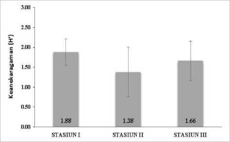 Indeks keanekaragaman (H') pada ketiga stasiun penelitian berkisar antara 1.38 hingga 1.88 (Gambar 3) keanekaragaman sebesar 1.88 terdapat pada stasiun I dan terkecil 1.38 ialah stasiun II. Stasiun I