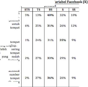 Tabel 4 menunjukkan bahwa 4 dari 5 indikator-pernyataan variabel Facebook (X1, X2, X4, dan X5) didominasi oleh jawaban Biasa Saja sedangkan 1 dari 5 indikator pernyataan (X3) didominasi oleh jawaban Setuju. Pada tabel 5 ditunjukkan hasil analisis-frekuensi pada 10 indikator pernyataan variabel-keputusan berkunjung (Y) berdasarkan hasil-alat hitung-SPSS.