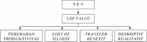 Total nilai ekonorni suatu sumberdaya dikelompokkan menjadi 2 (dua) yaitu: nilai penggunaan (use value) dan nilai intrinsik (non use value) (Pearce dan Turner, 1990; Pearce dan Moran, 1994; Turner, Pearce dan Bateman, 1994). Selanjutnya, dijelaskan bahwa nilai penggunaan ( use value) dibagi lagi menjadi nilai penggunaan langsung ( direct use value), nilai penggunaan tidak langsung ( indirect use value) dan nilai pilihan ( option value). Nilai penggunaan diperoleh dari pemanfaatan aktual lingkungan (Turner, Pearce dan Bateman, 1994). Nilai penggunaan berhubungan dengan nilai karena responden memanfaatkannya atau berharap akan memanfaatkan di masa mendatang (Pearce dan Moran, 1994).