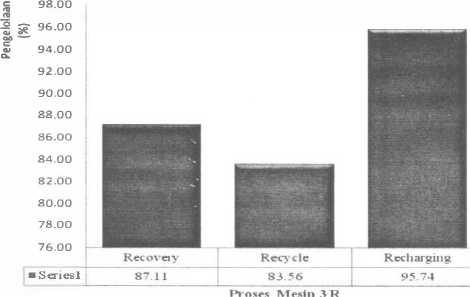 Variabel pengelolaan refrigeran CFC clan HFC dengan mesin 3R; 1) proses recovery, 2) proses recycle, clan 3) proses recharging1 kaitannya dengan sektor servicing pada bengkel AC mobil diukur dengan mewawancarai pada bengkel clan menanyakan dengan kuesioner. Efektivitas pengelolaan dilihat dari efektivitas pada masing-masing tahap pengelolaan. Nilai efek-tifitas pengelolaan dihitung dengan cara: Nilai efektivitas pengelolaan =A/B x I 00%