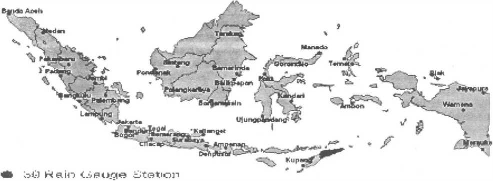 The research location was the Indonesia archipelago. It was located in 92.S0°E - l4 l.20°E and 8.14∙°N - 12.0°S (Figurel). Distribution of research locations were 27 stations, located in parts of Indonesia which covers the monsoonal types(A) (Jakarta, Bogor,Bandung,Jatiwangi, Cilacap, Tegal,Semarang, Surabaya, Kalianget, Denpasar, Ampenan, Kupang, Manado,lJjungpandang,Balikpapan,Samarinda,Ban-jarmasin, Palangkaraya,Biak,Wamena,Jayapura,Mer-auke, Jambi, Palembang, Bengkulu, and Lampung), 7 stations located at the semi-monsoonal types(B) (Tarakan, Sintang, Pontianak, Banda Aceh, Medan, Pekanbaru, and Padang) and 5 stations located at an-