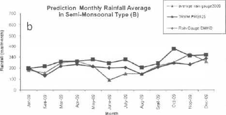 Figure 5 Prediction of monthly average rainfall pattern by TRMM PR and rain gauge (period January-December 2009) a) in Monsoonal type b) in Semi-monsoonal type c) in Anti-Monsoonal type