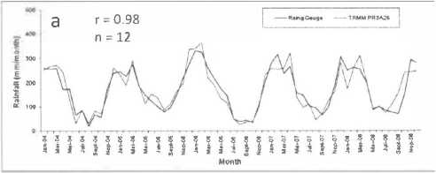 Figure 2 a) Average time series monthly rainfall and b) Monthly average rainfall pattern by TRMM PR and rain gauge (period 2004-2008) in Monsoonal Type (A).