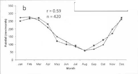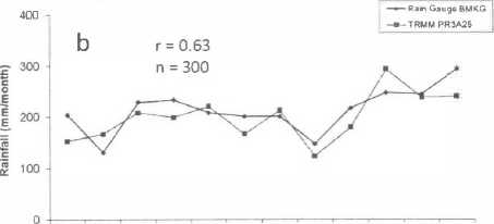 In the monsoonal type, the time series of monthly rainfall relationship showed 17 point gauges (r=O.S1-0.73) and 10 point gauges in low correlation (r=0.11-0.33), and RMSE based on 27 point gauges were more than 100 (mm/month). The average time series of monthly rainfall from TRMM PR3A25 was very slightly than monthly gauge data, where the average time series monthly rainfall were 170.0 (mm/month) and 170.1 (mm/month), respectively. The pattern of average time series monthly rainfall was quite similar with gauge data, and the coefficient correlation was high correlation (r=0.94), and RMSE was 35.1 (mm/ month)(Figure 2a). Meanwhile, monthly average rainfall pattern of TRMM PR showed very good agreement with the ground reference giving high correlation (r=0.98) and RMSE was 19.9 mm/month (Figure 2b).