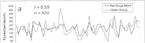The pattern of average time series monthly rainfall was similar to gauge 'data. This situation indicates TRMM PR3A25 products can be used to determine monthly climatic characteristics. The relationships of the monthly average rainfall measured by TRMM PR3A25 and rain gauge showed very good agreement with the ground reference giving high correlation (r=0.82-0.98) and RMSE was less than 50 (mm/ month). The pattern of monthly rainfall between TRMM PR and rain gauge data was quite similar which indicate that TRMM PR3A25 can be used to find rainfall patterns in the locations that do not have a rain gauge.