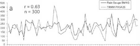 monthly rainfall average were 0.18 (rain gauge) and 0.28 (TRMM PR3A25) with RMSE were 64.S (rain gauge) and 60.1 (TRMM PR3A2S)(Figure5c).