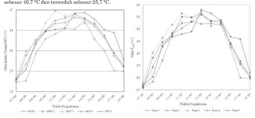 Pola yang sama di kedua profil indeks termal PET menunjukkan pada tengah hari dengan intensitas radiasi yang lebih tinggi dibandingkan dengan pagi dan sore hari memiliki nilai indeks termal PET yang tinggi. Hal ini terjadi karena pada tengah hari radiasi matahari memberikan energi panas yang tinggi yang berasal dari fluks radiasi matahari gelombang pendek dan gelombang panjang dengan sudut datang yang besar terhadap permukaan. Pengaruh biometeorologi fluks radiasi matahari gelombang pendek dan gelombang panjang ditranspormasikan ke dalam parameter Tmrt(Wachter 1950; Bradkte 1951 dalam Matzarakis et al., 2007) di mana ditemukan pula pola profil Tmrt yang tinggi saat tengah hari (Gambar 2).